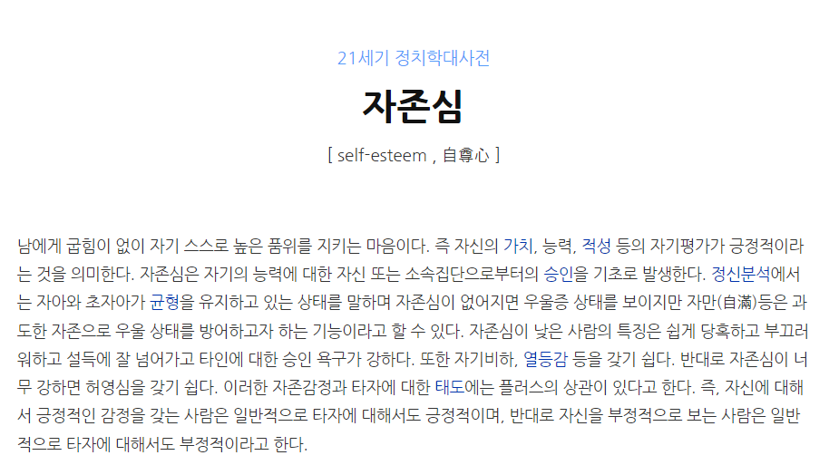 남과의 경쟁 속에서 나에 대한 긍정적인 마음입니다. 저 잘난 사람 앞에서도 나는 밀리지 않는다라는 생각입니다.
